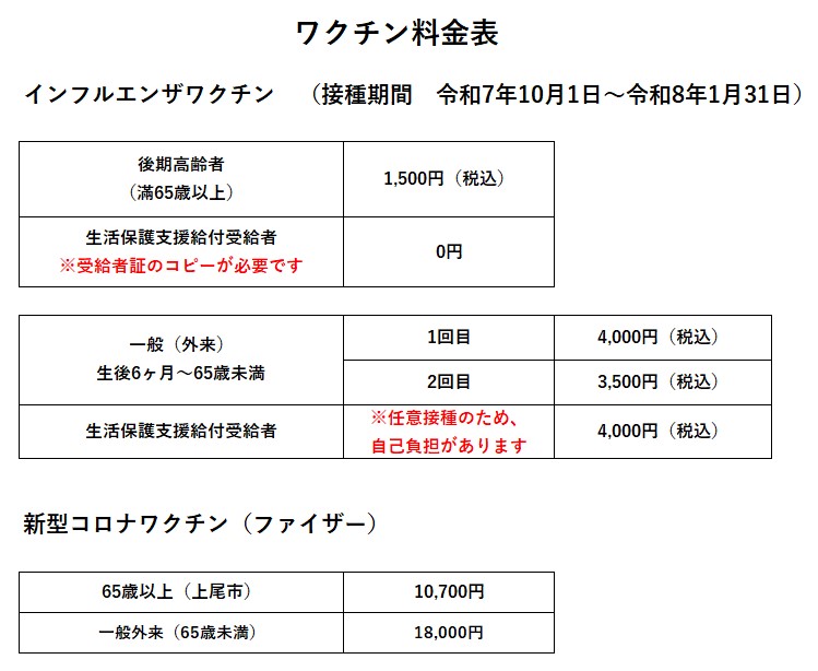 お知らせ 医院からのお知らせをご案内いたします。 インフルエンザ・新型コロナワクチン接種開始しました。 2025年10月03日 令和7年10月1日より、インフルエンザワクチンと新型コロナウイルスワクチンの接種を開始しました。 予約は必要ございません。診療時間内にお越しください。 « 前の記事